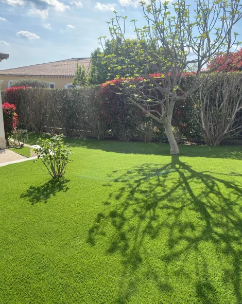 Gazon synthétique, idéal pour une pelouse verte et entretenue toute l'année, sans les contraintes d'entretien.